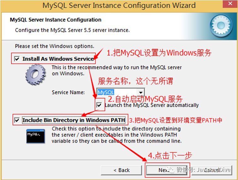 8、选择是否将mysql安装为windows服务,还可以指定Service Name(服务标识名称),是否将mysql的bin目录加入到Windows PATH(加入后,就可以直接使用bin下的文件,而不用指出目录名,比如连接,“mysql.exe -uusername -ppassword;”就可以了,不用指出mysql.exe的完整地址,很方便),我这里全部打上了勾,Service Name不变。按“Next”继续。