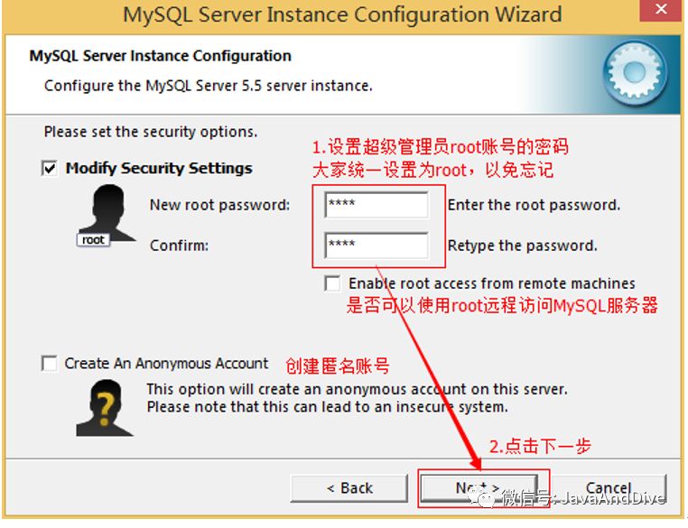 9、询问是否要修改默认root用户(超级管理)的密码。“Enableroot access from remote machines(是否允许root用户在其它的机器上登陆,如果要安全,就不要勾上,如果要方便,就勾上它)”。最后“Create AnAnonymous Account(新建一个匿名用户,匿名用户可以连接数据库,不能操作数据,包括查询)”,一般就不用勾了,设置完毕,按“Next”继续。