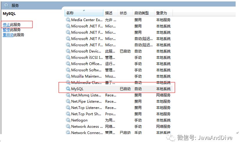 找到“控制面板”-> “管理工具”-> “服务”,停止MySQL后台服务。