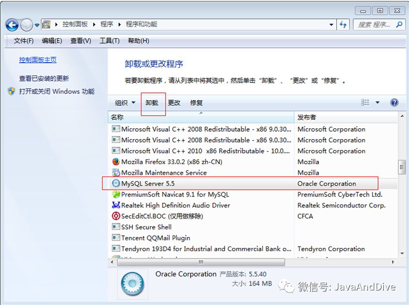 2.卸载MySQL安装程序。找到“控制面板”-> "程序和功能",卸载MySQL程序。