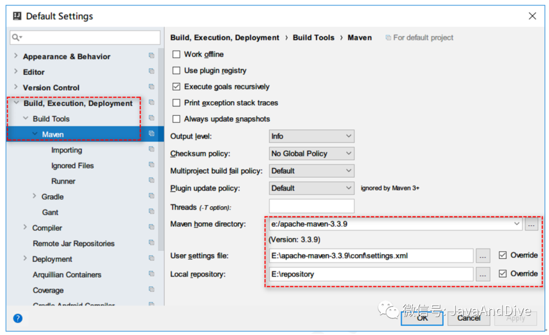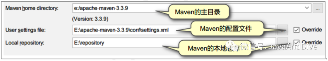 3) 配置以下三项信息:Maven的主目录,配置文件settings.xml和本地仓库repository目录