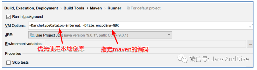 4) 选择Build,Execution,Deployment-->Build Tools -->Maven-->Runner,设置Maven启动虚拟机的选项:VMOption,设置所有资源先从本地仓库查找,如果本地仓库中没有才去互联网找。