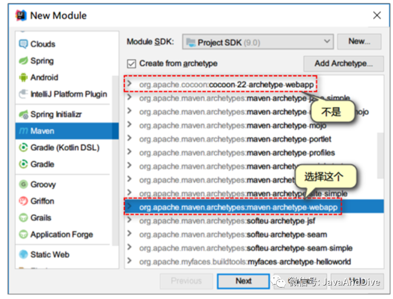 1) 选择Maven骨架时,要选择maven-archetype-webapp,注:不要选成cocoon-22-archetype-webapp。