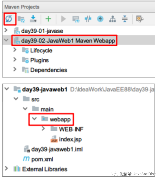 6) 默认骨架创建好的JavaWeb工程如下,选右边的Maven Projects中的第2个项目刷新。左边的webapp图标上出现蓝色小点。表示这是Web页面的根目录,类似于以前的web目录。