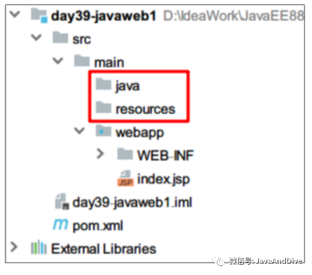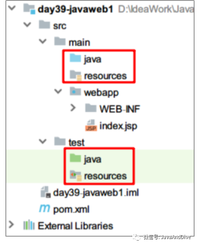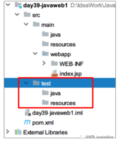 2) 在src目录下,与main目录同级,创建test目录,并在test目录下创建java文件夹和resources,如图