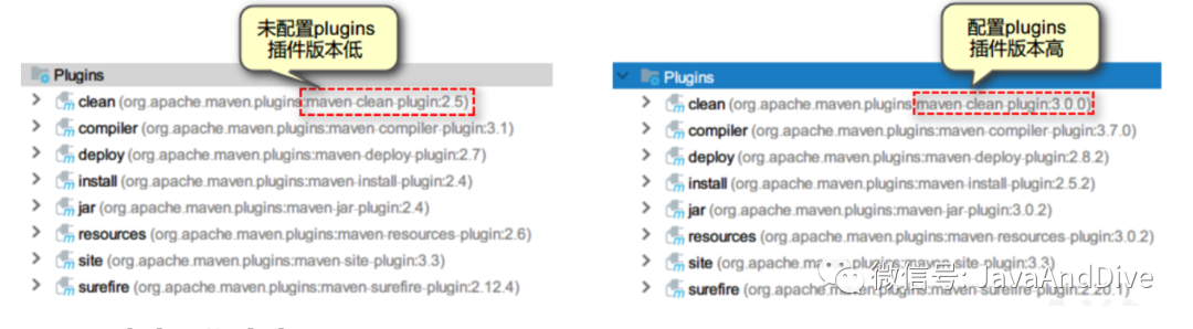 Maven管理项目生命周期过程都是基于插件完成的,如果在pom.xml中配置了plugin插件,则使用配置的插件版本。如果没有配置,则使用Maven默认的插件版本,默认的插件版本更低一些。