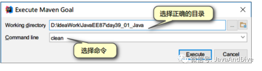 5) 也可以选择Execute Maven Goal选择clean命令执行,注意选择正确的路径。这种方式主要用于命令带参数的情况。