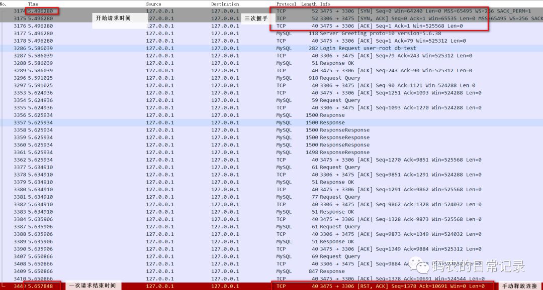 上面的代码通过获取一个mysql的connection来进行查询,那么这个过程是如何实现的?为什么说数据库的连接是很耗费资源的呢?带着这个问题,使用wireshark试着抓一个本地的包来看一下这个调用过程,可以看到底层通过TCP协议+mysql二进制协议来执行,具体过程如下: