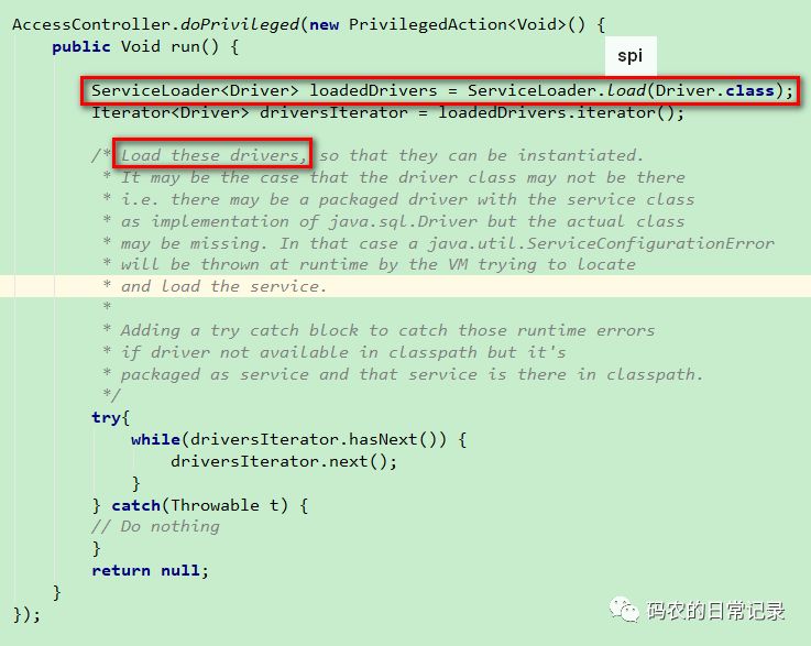 这段代码实际上使用spi机制 获取META-INF包含的Driver实现类,并通过Iterater.next()把类加载到ClassLoader来执行其中的静态方法,