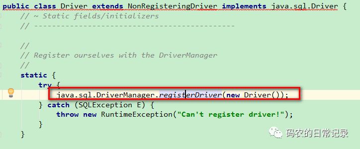比如mysql 提供的 Driver实现类的静态代码块如下, 也就是调用DriverManager的registerDriver方法: