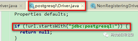 获取Connection对象时,通过迭代DriverManager中的registerDrivers ,分别对url前缀进行判断,如果满足条件则调用Driver获取Connection对象,比如在Postgresql提供的JDBC中的判断条件为: