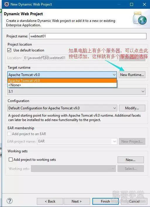 如上图所示,可以添加多个服务器,可以是tomcat,也可以是jboss等等。注意此处添加了服务器tomcat9.0并不代表我们的工程就是为了这个服务器而开发的,添加这个服务器只是为了引入开发web工程的规范,我们不一定要在这个服务器上运行我们的代码:java并没有实现servlet和jsp的运作原理,只是对它们提出了规范,就像接口一样,具体的实现交给容器,这样就会产生各种各样的web服务器,每种服务器都有自己的优势,用户也会有更多的选择。而规范并没有放在jdk中而是放在了服务器上,所以我们添加服务器是为了引入规范,然后在这规范的基础之上去编写代码。
