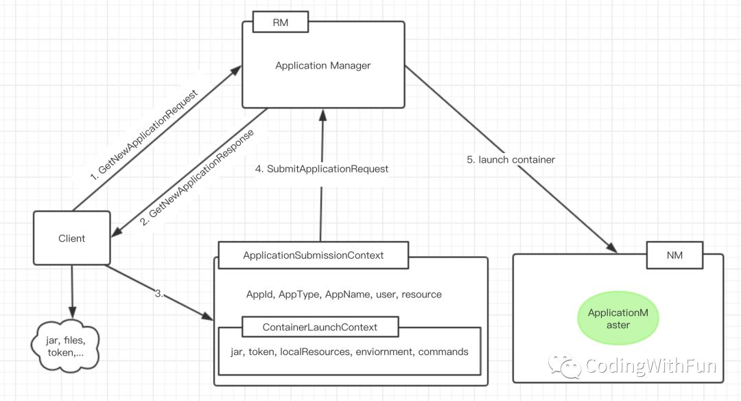 构造ApplicationSubmissionContext对象,里面包含了AppId, AppType, AppName等信息,以及启动AM需要的ContainerLauchContext, 其包含启动AM需要的环境变量、资源文件地址,启动命令等;
