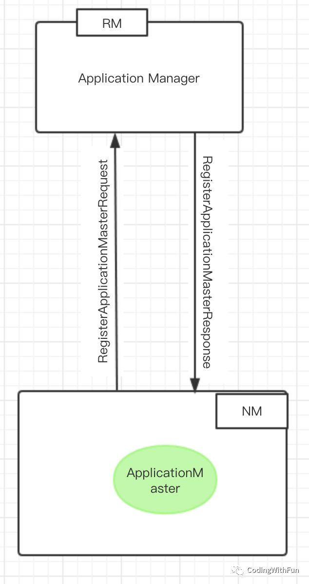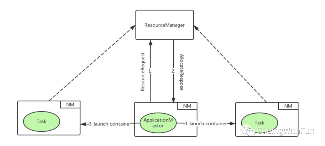 AM向RM进行注册,注册完成后,应用的状态会从ACCEPT变成RUNNING。如果AM一直不进行注册,默认10分钟后RM会杀死该AM; AM通过RPC函数ApplicationMAsterProtocol#allocate向RM申请资源,即使AM不再需要申请资源也需要周期性调用该函数,以保持与RM之间的心跳; AM申请到资源后,进行再次分配给内部的任务,通过直接与NM通信启动Container; 一旦整个应用完成,AM通过RPC函数ApplicationMasterProtocol# finishApplication告诉RM应用程序执行完毕,并退出;