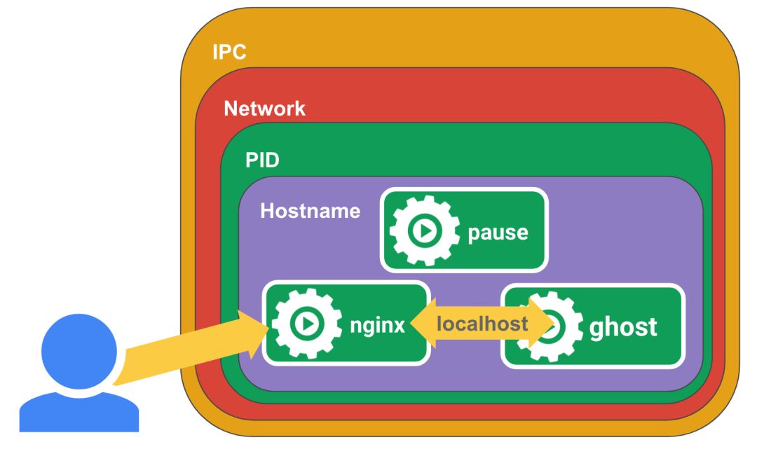 $ docker run -d --name ghost --net=container:pause --ipc=container:pause --pid=container:pause ghost