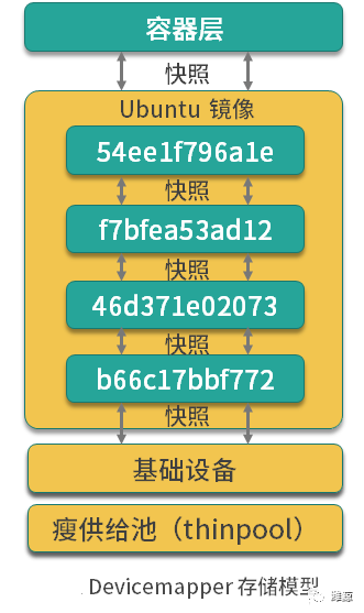 这个 Ubuntu 镜像一共有四层,每一层镜像都是下一层的快照,镜像的最底层是基础设备的快照。当容器运行时,容器是基于镜像的快照。综上,Devicemapper 实现镜像分层的根本原理就是快照。