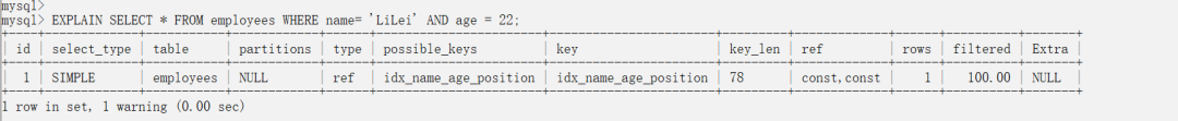 EXPLAIN SELECT * FROM employees WHERE name= 'LiLei' AND age = 22;