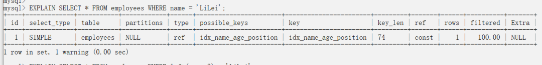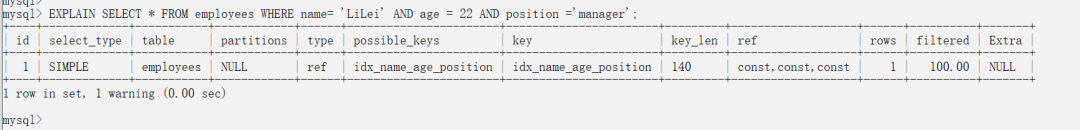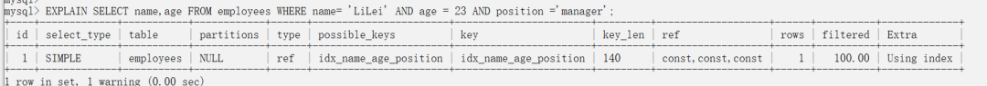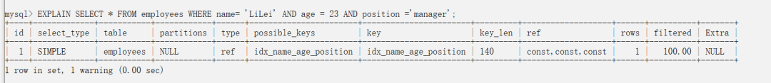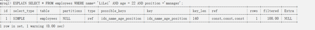 EXPLAIN SELECT * FROM employees WHERE name= 'LiLei' AND age = 23 AND position ='manager';