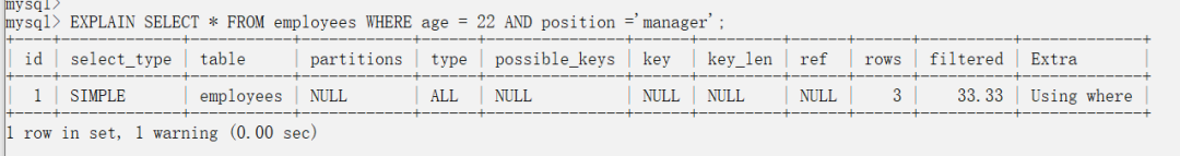 EXPLAIN SELECT * FROM employees WHERE age = 22 AND position ='manager';
