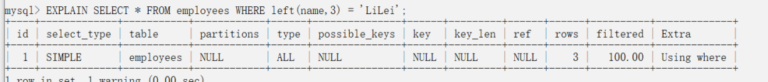 EXPLAIN SELECT * FROM employees WHERE left(name,3) = 'LiLei';