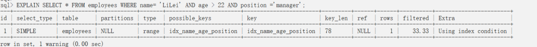 EXPLAIN SELECT * FROM employees WHERE name= 'LiLei' AND age > 22 AND position ='manager';