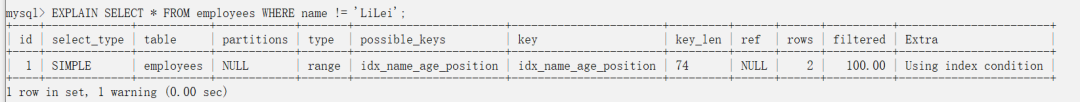 EXPLAIN SELECT * FROM employees WHERE name != 'LiLei';