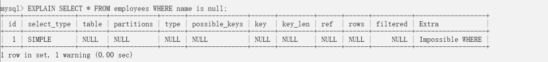 EXPLAIN SELECT * FROM employees WHERE name is null;