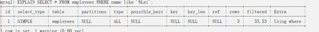 EXPLAIN SELECT * FROM employees WHERE name like '%Lei';