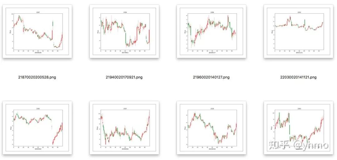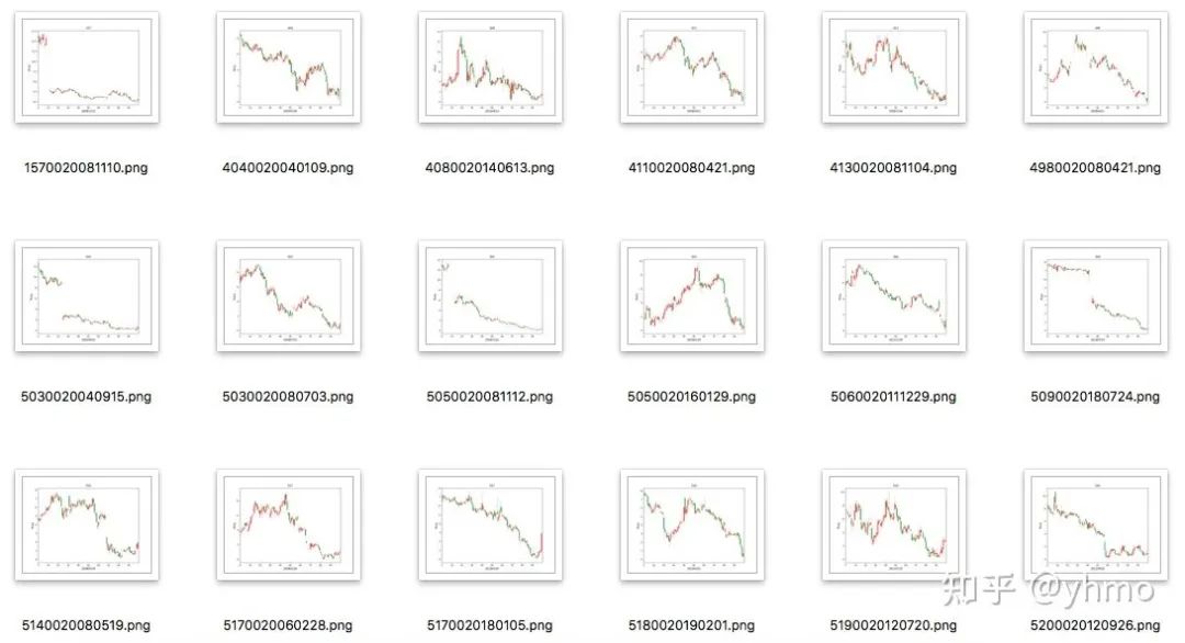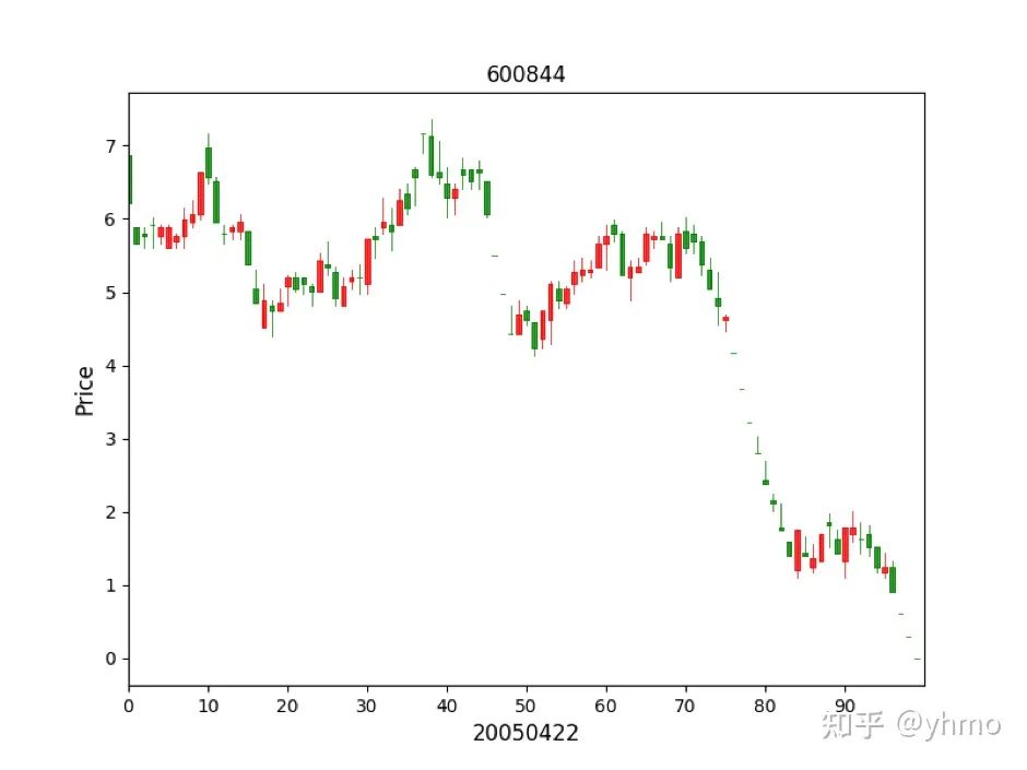 No.1 300207 欣旺达5 days growth: 9.86 (-0.47, 1.82, -4.4, 5.89, 7.02, )10 days growth: 11.709999999999999 (-0.47, 1.82, -4.4, 5.89, 7.02, 3.16, 0.69, -2.0, )No.2 600340 华夏幸福5 days growth: 4.450000000000001 (10.05, -1.74, -0.29, -0.59, -2.98, )10 days growth: 6.040000000000001 (10.05, -1.74, -0.29, -0.59, -2.98, -0.61, -1.08, 3.28, )No.3 688313 仕佳光子5 days growth: -5.04 (-0.23, -0.29, 0.59, -4.2, -0.91, )10 days growth: 2.1700000000000004 (-0.23, -0.29, 0.59, -4.2, -0.91, 5.65, 1.16, 0.4, )No.4 603283 赛腾股份5 days growth: -12.1 (-0.42, -2.85, -2.57, -2.11, -4.15, )10 days growth: -7.239999999999999 (-0.42, -2.85, -2.57, -2.11, -4.15, 0.69, 1.72, 2.45, )No.5 603920 世运电路5 days growth: -9.040000000000001 (-0.18, -1.58, 1.49, -4.29, -4.48, )10 days growth: 2.0599999999999987 (-0.18, -1.58, 1.49, -4.29, -4.48, 10.03, -2.28, 3.35, )对于第一名的 300207,结果显示它跟 600844 的 2005 年 4 月 22 日的前100天相似度距离为 101,后续 5 到 10 天的盈利为 10% 左右。我们先看一下 600844 的 2005 年 4 月 22 日的前 100 天(笔者使用 Python 的 mpl_finance 库以及 Matplotlib 库来绘制蜡烛图):