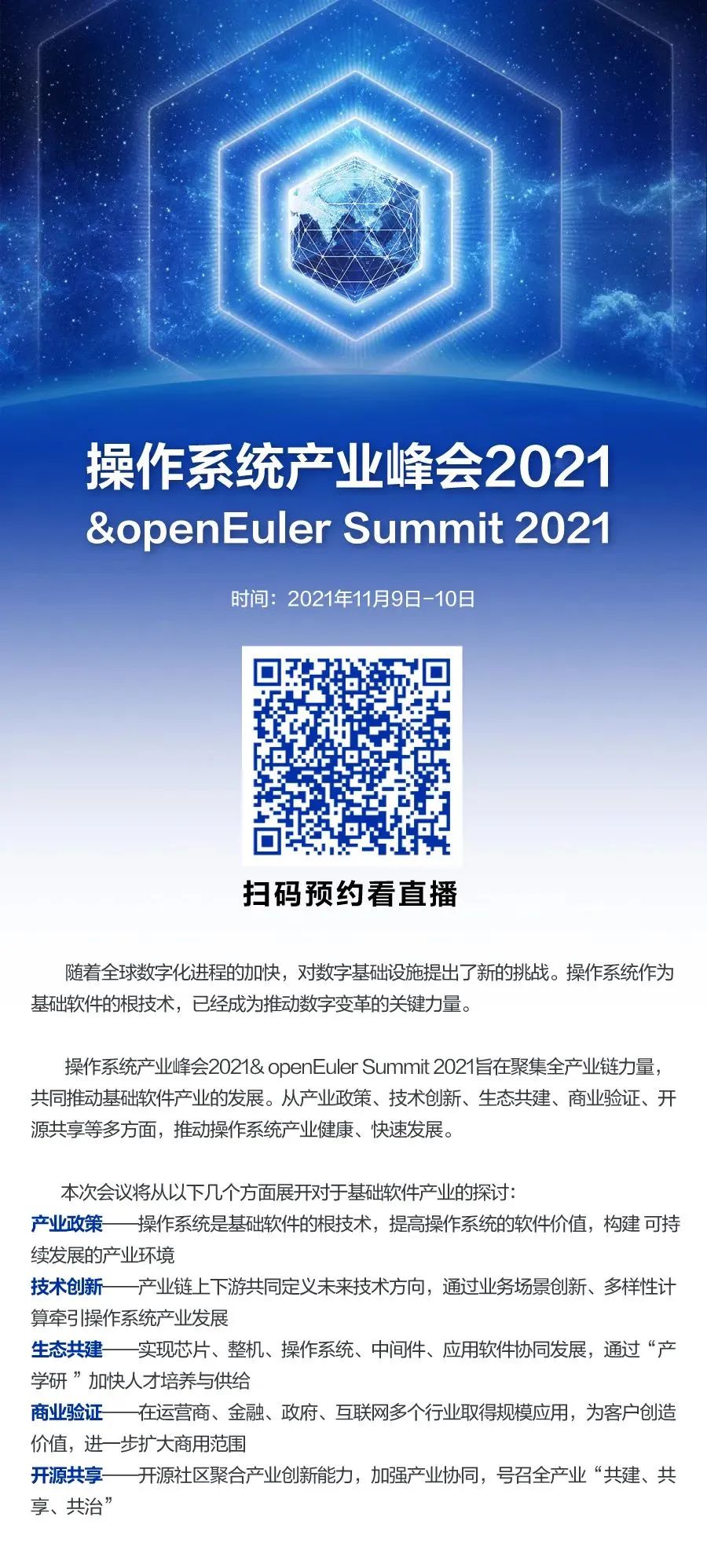 2021年11月9日-10日,“操作系统产业峰会&openEuler Summit 2021”将在国家会议中心举行。本次峰会以“立根铸魂,逐梦数字时代星辰大海”为主题,旨在聚集全产业链力量,共同推动基础软件产业的发展。从产业政策、技术创新、生态共建、商业验证、开源共享等多方面,推动操作系统产业健康、快速发展。