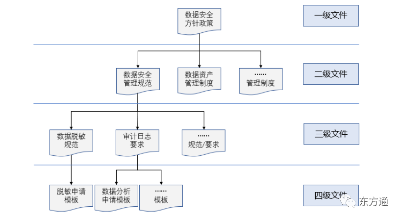 为便于管理,制度需要按照体系化的方式进行建设,可以参考《数据安全建设指南-2013数据安全治理体系要求》,将制度分为四级,如下图所示: