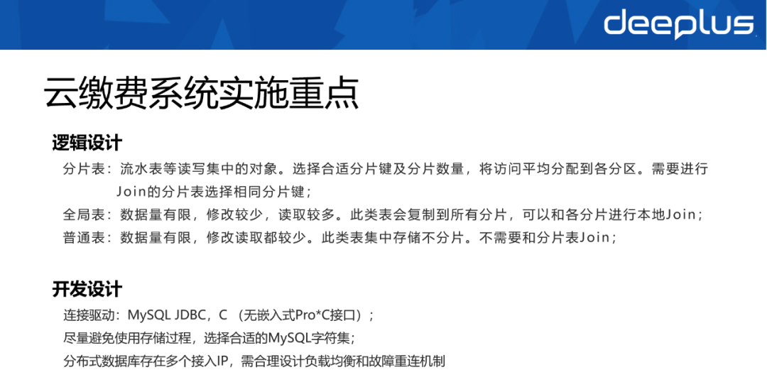 A:差不多,这个也主要是在开发层做的设计。对于表的分类大致是这种方向,因为其实就是流水表、日志表最大,这种表在原来的Oralce的部署里面就已经做了一层甚至两层的分区了,只不过它提供的存储还是在一个里边。在这块儿,如果将分片表按照分片键做了拆分,实际上就已经部署到不同的物理分区上了。