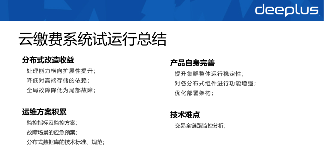 因为这个对于我们来说也是第一次做这种比较大的改造转型,所以在监控指标及监控方案、故障场景的应急预案、分布式数据库的技术标准&规范等,都是通过这次的探索和迁移总结出了一些经验。