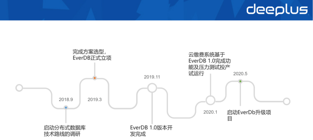 19年第一季度完成了方案的选型,同时这个项目也正式地立项。其实这中间经历了大概有半年的时间,调研的过程我们还是收获很大的,因为我们看到了同业或者是互联网都在用什么样的产品,用什么样的架构,走什么技术路线,这些作为我们的参照依据,最终才有了EverDB的立项。