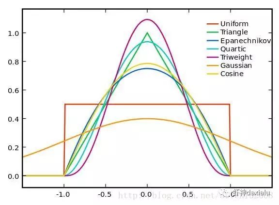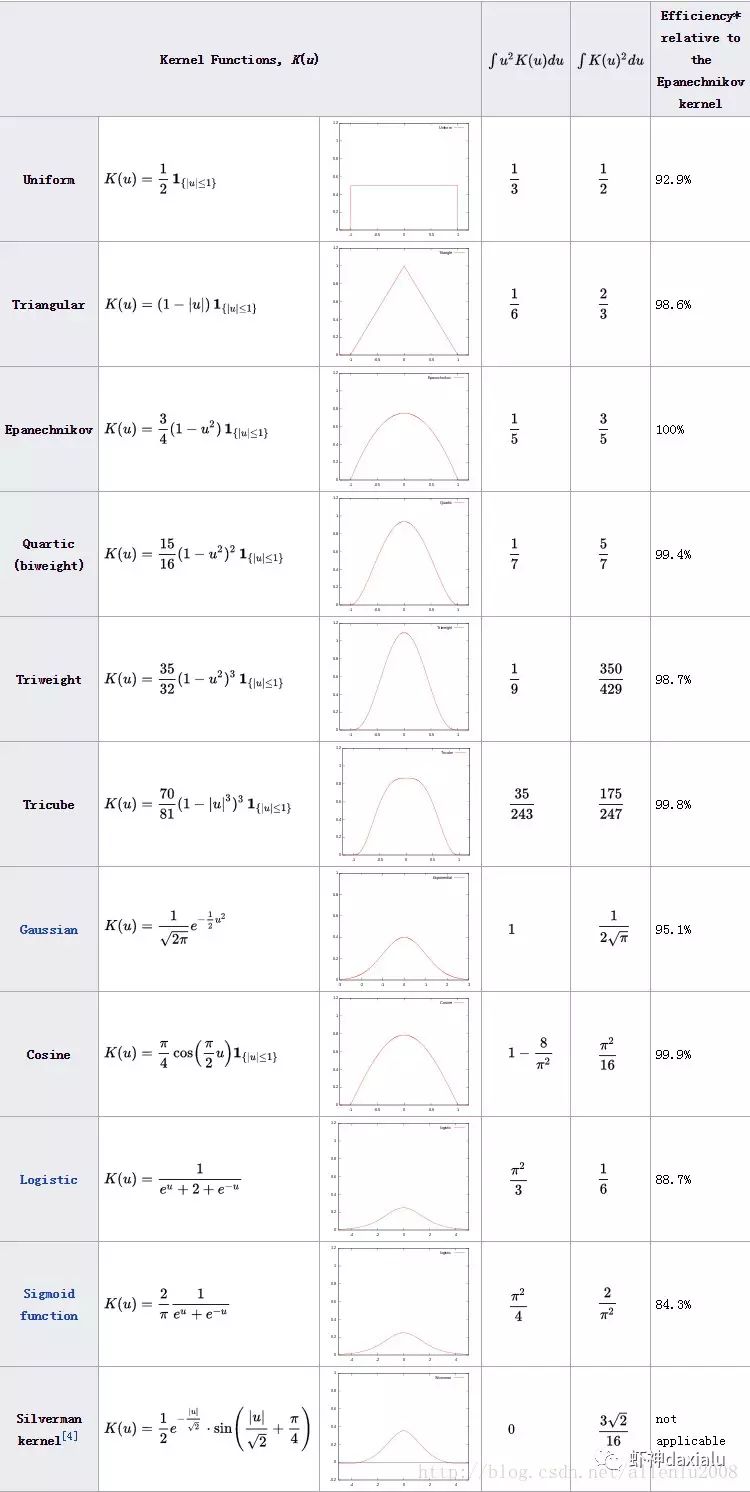 不同的核,对应的核表面函数是不一样的,以下两个图表来源于wikipedia,原始地址如下:(当然,这里面更多,但是比较有代表性的6种,都包含进去了)