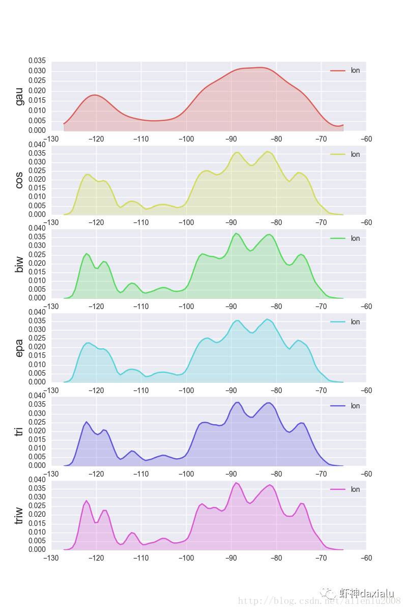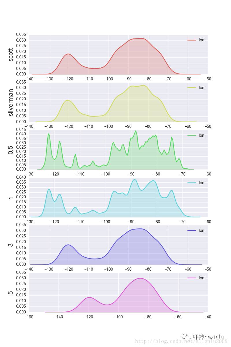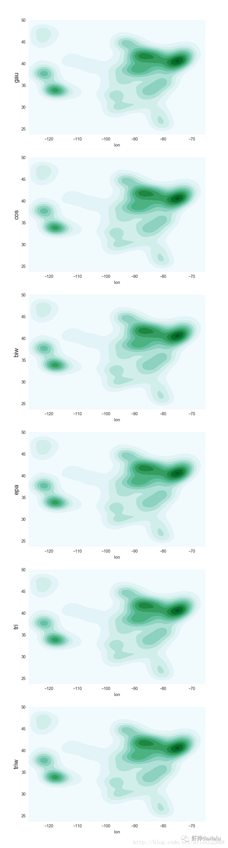 seaborn的kdeplot工具,最大的特点是可选参数很多,他支持六种核密度方法和多种带宽模式,如下: