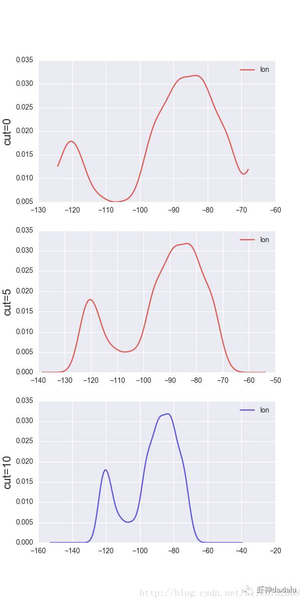 cut参数表示,绘制的时候,切除带宽往数轴极限数值的多少,这个参数可以配合bw参数使用,如下: