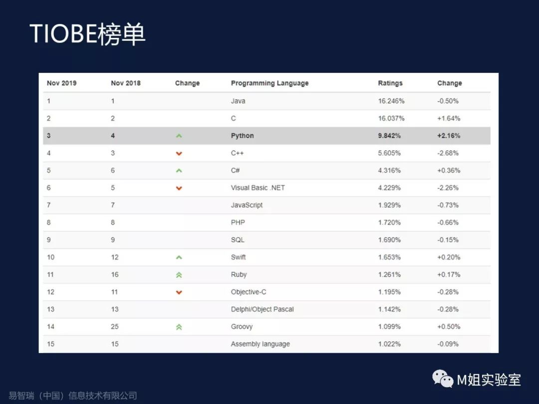 实际上大家如果关注一下之前的榜单,大约从2004年开始, Python上榜,但是很多年一直都还是第8名的样子,近几年开始飙升,从去年就到了第4名,今年已经冲入了top3。