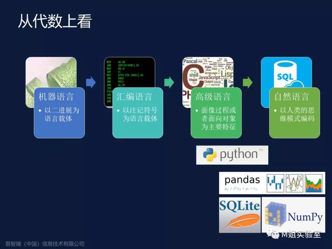 在未来,四代语言在数据分析中的比重会越来越大,所以Python在做数据分析的时候经常会使用类似这样的包,比如pandas,numpy等,除此之外还有SQLite,超轻量级的SQL语言数据库,在Python里面内置的。所以我说拥有这些特性的Python是介于三代和四代之间的语言。