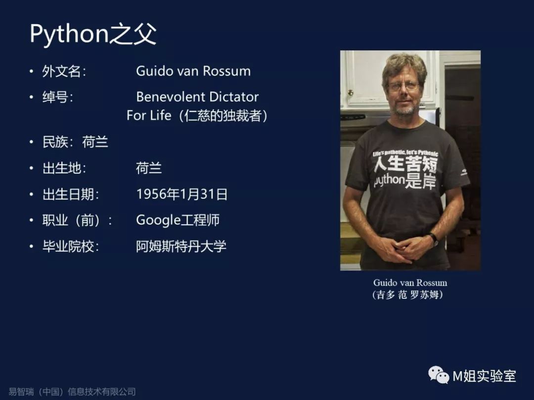 下面介绍一下Python之父,他叫吉多·范·罗苏姆,出生在1956年,曾经是Google的工程师。他被称之为Python之父,是因为他曾经在一次旅行中得到了一些想法,然后就发明了Python语言。
