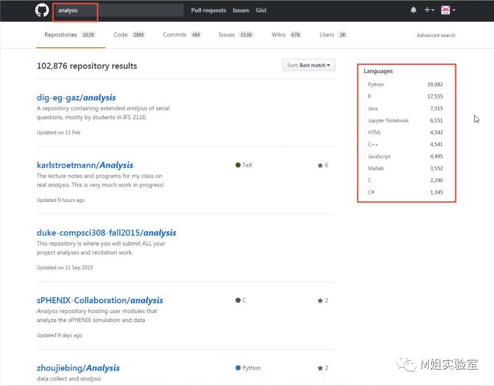 我在GitHub上做了一系列的关键字搜索,搜索的第一个关键词是analysis(分析),大家可以看到在搜索到结果里,Python的排名第一,一共是19082个工程是Python写的。我们再搜索“人工智能”,Python依然排名第一,搜索第三个单词爬虫(crawler),以及第四个单词数据处理,第五个单词“机器学习”Python均是排名第一。搜索network(网络),Python还是第一,然后我又搜索了一些比较奇怪的单词,比如脚本(script),Python第一,搜索大数据,Python终于排名第二了。因为大数据的第一平台Hadoop,是用Java写的,所以Java排名第一。