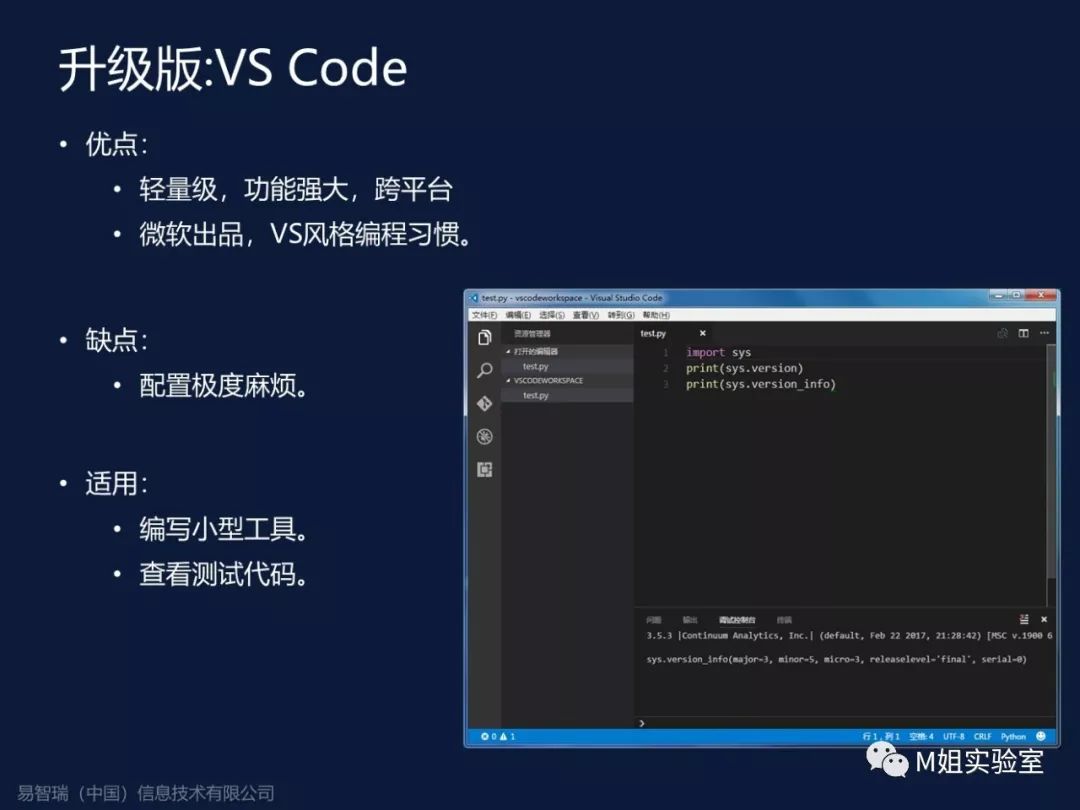 比如VS Code,这是一个轻量级的跨平台工具,微软出品。优点:轻量级、功能强大、跨平台。缺点是配置麻烦。因为他所有的配置都不是通过鼠标完成的,而是通过写配置文件完成的。适用于编写小型工具,查看代码测试。