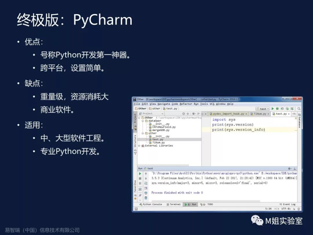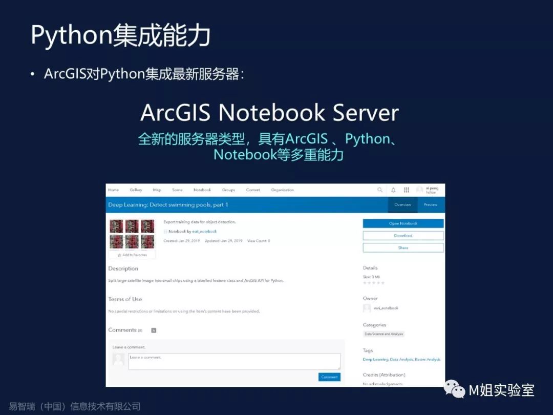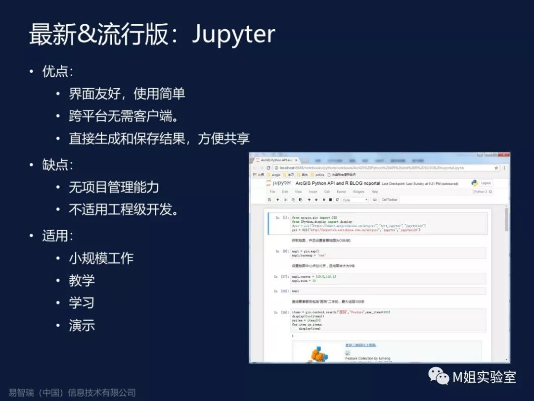 在ArcGIS里,有个最新的Python集成工具叫ArcGIS Notebook Server,他的核心就是像安装了ArcGIS的服务器一样,安装了一个Python的开发服务器,可以让你在服务端调用任何资源,你在本地不用任何安装,每个人都可以获得一个开发容器,你的所有代码都在这个容器内,不会受限于本地的计算资源或者突然断电造成的代码丢失。有兴趣的人可以试一下这个工具。