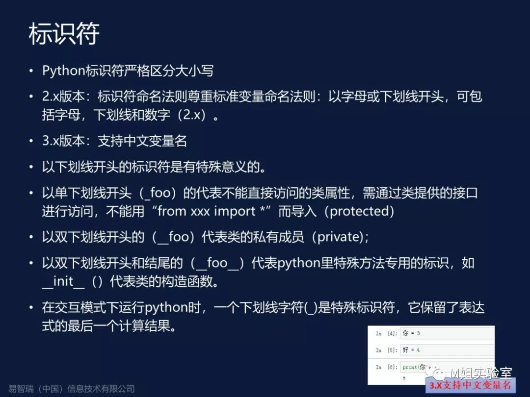 Python标识符严格区分大小写,2.0的时候要遵循标准变量名法则,3.0的时候支持中文变量名。Python的下划线是保留字符,不能乱用,一个下划线代表内部成员的变量,两个下划线代表系统专用变量。