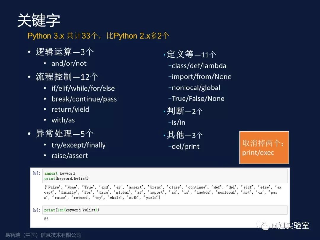 Python有系列关键字,Python3.x有33个。大家知道写代码不要使用关键字作为你的变量命名,否则程序一定报错。