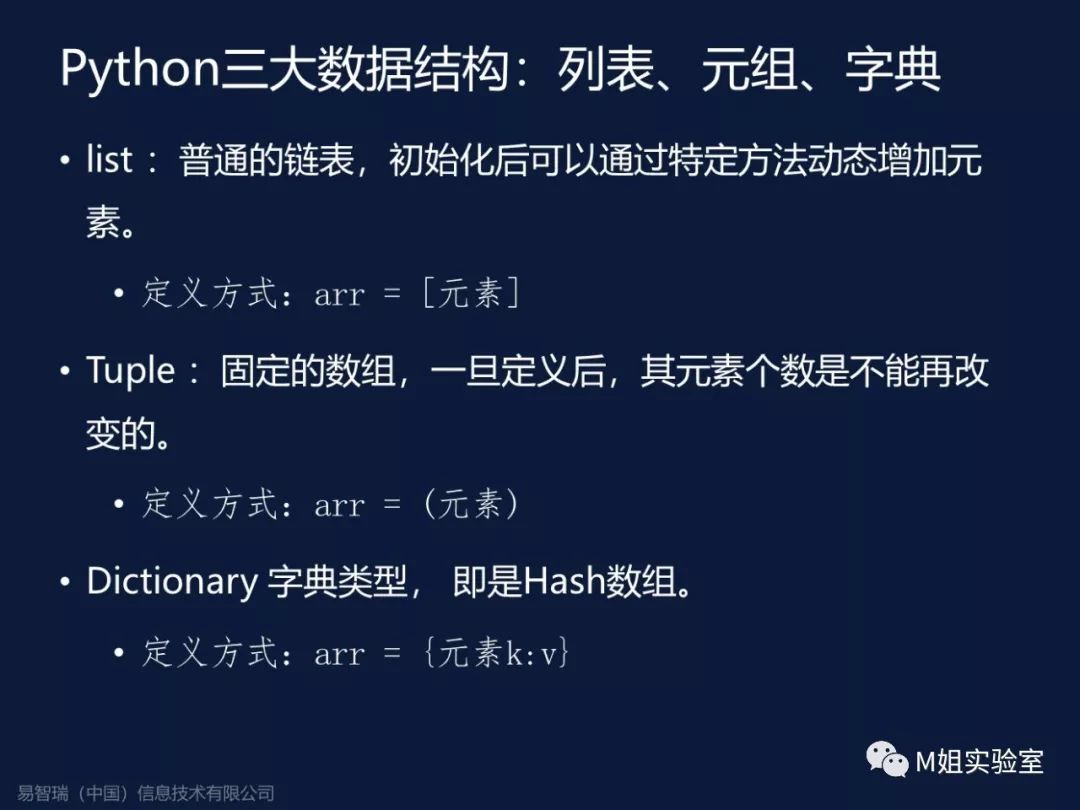 Python一共有三大数据结构,列表、元祖和字典,这里就不详细介绍了,大家有兴趣的话可以去网上查阅他的相关信息。