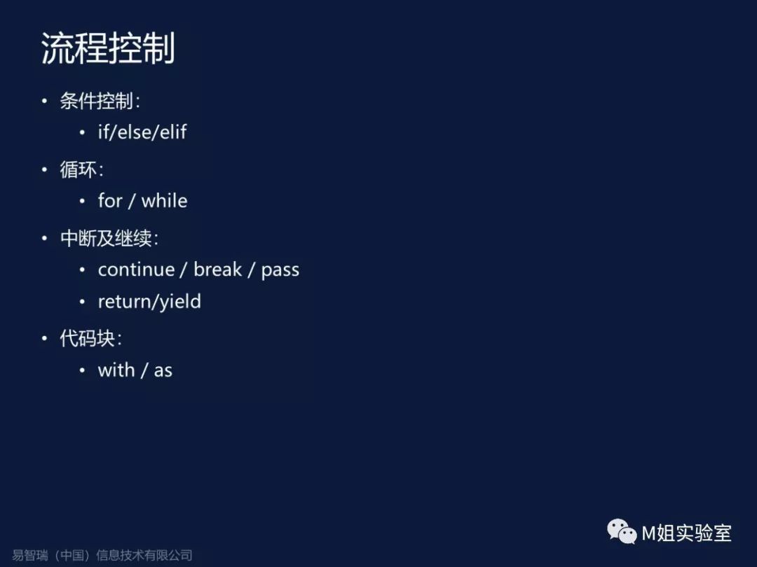 流程控制语句,雷同与所有的三代语言中面向结构的语言部分,如果你有任何一种三代语言的编程基础,对于Python的流程控制语言就应该不用多说 ,当然,他也有一些自己特有的特性,比如列表推导式等,有兴趣的同学可以自行查阅相关资料。