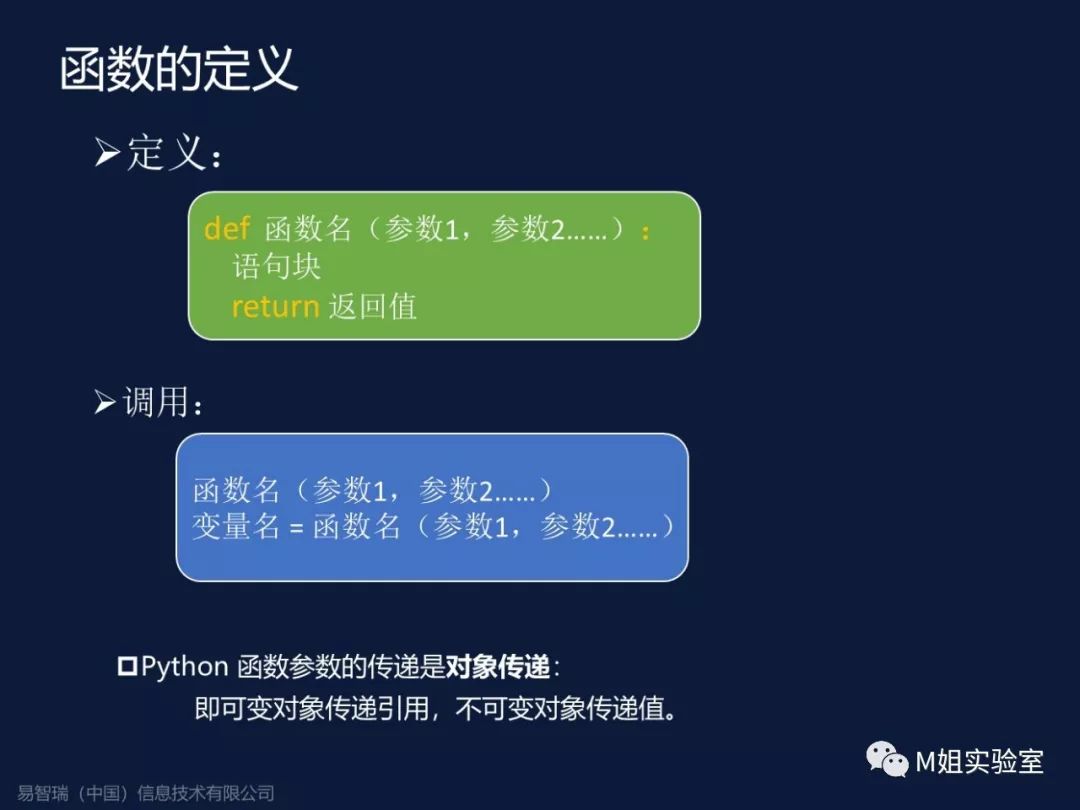 函数的定义,也是一样,所不同的是,Python传参的方式,即不是引用传递,也不是值传递,而是一种称之为对象传递的方式:传入的对象是可变的,则是按引用传递,如果是不可变的,则是值传递。