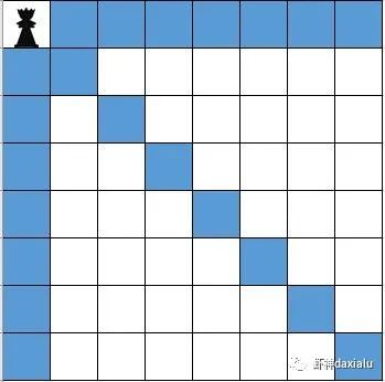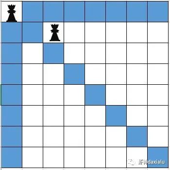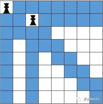 比如,我们在第一个位置上,放好一个皇后,那么蓝色的位置就不能在放置了: