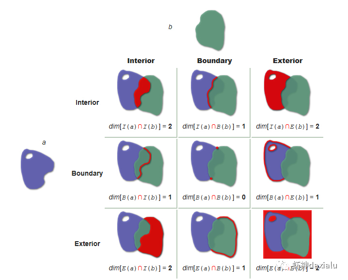 (Dimensionally Extended nine-Intersection Model (DE-9IM),用于描述两个几何图形空间关系: